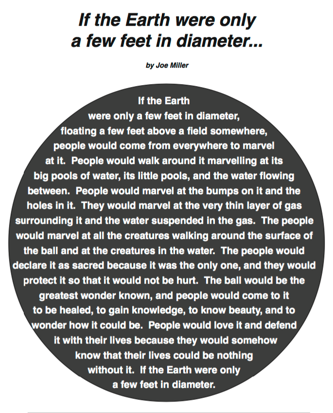 "If the Earth were only a few feet in diameter, floating a few feet above a field somewhere, people would come from everywhere to marvel at it. People would walk around it marveling at its big pools of water, its little pools, and the water flowing between the pools. People would marvel at the bumps on it, and the holes in it, and they would marvel at the very thin layer of gas surrounding it and the water suspended in the gas. The people would marvel at all the creatures walking around the surface of the ball and at the creatures in the water. The people would declare it sacred because it was the only one, and they would protect it so that it would not be hurt. The ball would be the greatest wonder known, and people would come to pray to it, to be healed, to gain knowledge, to know beauty, and to wonder how it could be. People would love it and defend it with their lives because they would somehow know that their lives, their own roundness, could be nothing without it. If the Earth were only a few feet in diameter..." - Joe Miller